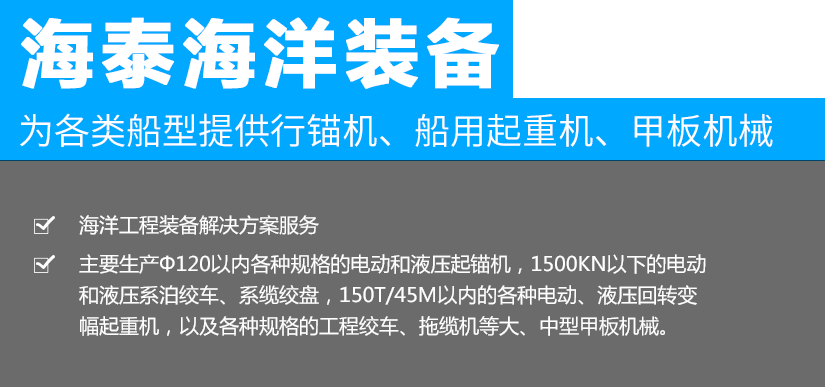 江蘇海泰海洋裝備有限公司位于素稱“銀杏之鄉(xiāng)”的泰興市,2018年投資建設,至今已經成為產品研發(fā)、生產制造,調試服務為一體的設備配套企業(yè)。公司從事海洋裝備(設備)及配件的制造、設計、安裝,維修;船用錨機、絞車、起重機、舾裝件、電氣設備、環(huán)保設備設計、制造。公司成立以來,就與中國船舶工業(yè)集團公司第701所、702所、704所、708所、上海船舶研究設計院等多家船舶科研院所建立了技術合作關系,產品應用于......